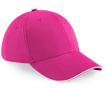 Štítek TearAway pro snadnou změnu značky, design 6 panelů, střední profil, předem zakřivený kšilt, kontrastní barevný sendvičový kšilt, strukturované přední panely, prošitá větrací očka, popruh z látky s tříkluznou sponou
