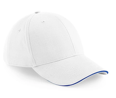 Štítek TearAway pro snadnou změnu značky, design 6 panelů, střední profil, předem zakřivený kšilt, kontrastní barevný sendvičový kšilt, strukturované přední panely, prošitá větrací očka, popruh z látky s tříkluznou sponou