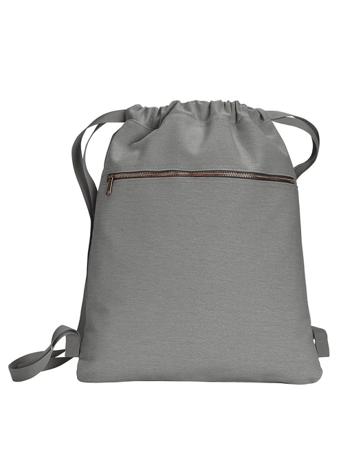 Tkané ramenní popruhy, hlavní kapsa na stahovací plochou šňůrku, přední kapsa s mosazným zipem.