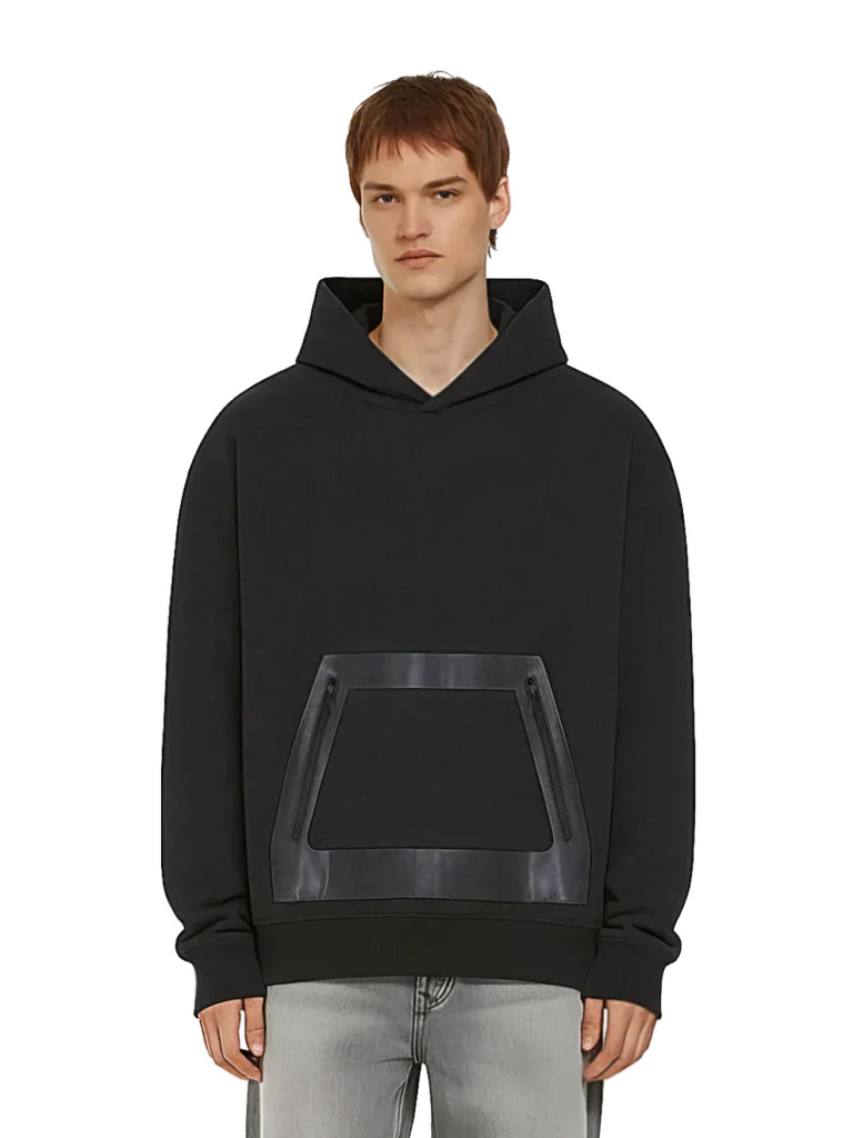 Výrazný panel na hrudi ve stylu veganské kůže s dvojitými kapsami na zip vytváří odvážný vizuální kontrast, zatímco čistá, moderní kapuce, snížené ramenní švy a žebrované manžety a lem dotvářejí moderní siluetu. Výrazné detaily panelů činí tento model obzvláště vhodným pro streetwear, luxusní maloobchodní kolekce a zboží s velkým dopadem.