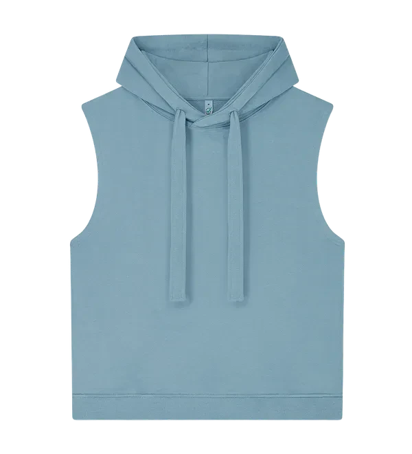 Tkanina je vyrobena ze 100% organické bavlny a má jemnou semišovou texturu, která zajišťuje prvotřídní pocit na dotek a každodenní pohodlí. Mezi designové detaily patří moderní bezrukávový střih, praktická boční kapsa a výrazná stahovací šňůrka, která dodává modelu výrazný vzhled.