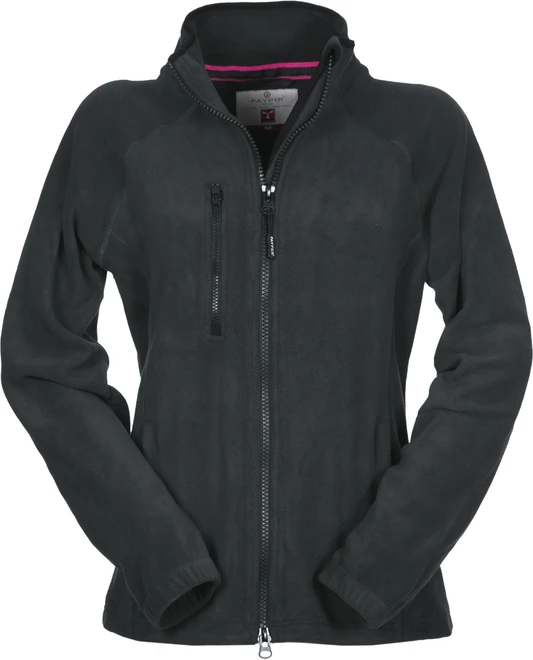 Černý plastový zip 8 mm široký, raglánové rukávy, stahovací šňůrka v pase, elastické manžety, 2 kapsy se skrytým zipem, 1 přední kapsa na hrudi, za krkem výztužná páska v kontrastní barvě, vyztužené švy, vypasovaný střih