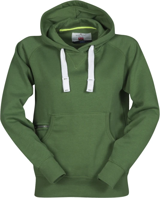 Dvojité švy, kapuce, kovová očka na kapuci, bílá stahovací šňůrka, raglánové rukávy, dekorativní prošití do "V" pod výstřihem, klokaní kapsa, malá kapsa na zip, elastické manžety a spodní lem, vyztužené švy, vypasovaný střih