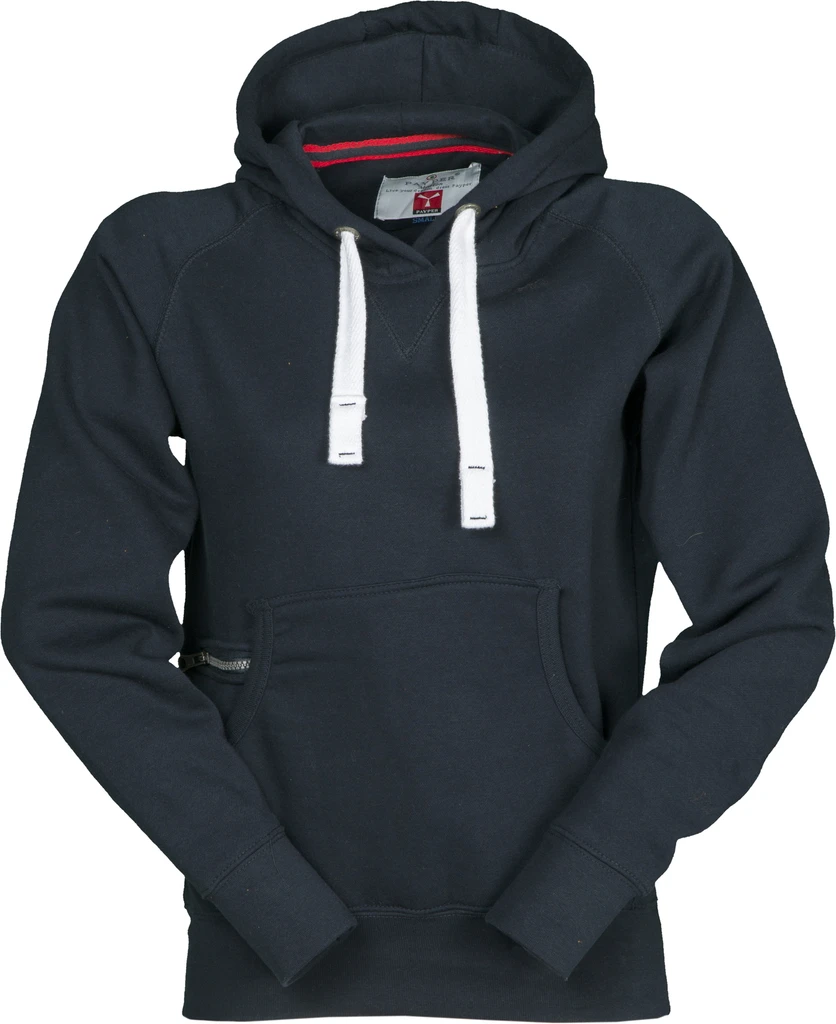 Dvojité švy, kapuce, kovová očka na kapuci, bílá stahovací šňůrka, raglánové rukávy, dekorativní prošití do "V" pod výstřihem, klokaní kapsa, malá kapsa na zip, elastické manžety a spodní lem, vyztužené švy, vypasovaný střih