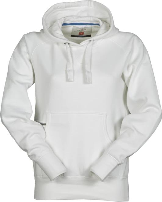 Dvojité švy, kapuce, kovová očka na kapuci, bílá stahovací šňůrka, raglánové rukávy, dekorativní prošití do "V" pod výstřihem, klokaní kapsa, malá kapsa na zip, elastické manžety a spodní lem, vyztužené švy, vypasovaný střih