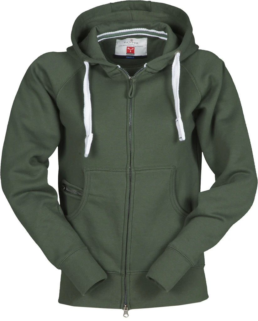 Vypasovaný střih, plastový zip po celé délce, kovový dvojcestný jezdec, kapuce s dvojitým prošitím švů, bílá stahovací šňůrka, kovová očka na kapuci, raglánové rukávy, klokaní kapsa, malá kapsa na zip, elastické manžety a spodní lem, vyztužené švy