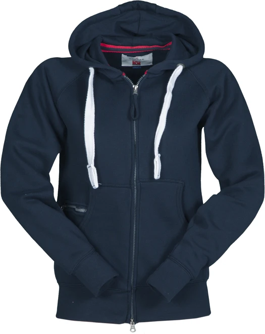 Vypasovaný střih, plastový zip po celé délce, kovový dvojcestný jezdec, kapuce s dvojitým prošitím švů, bílá stahovací šňůrka, kovová očka na kapuci, raglánové rukávy, klokaní kapsa, malá kapsa na zip, elastické manžety a spodní lem, vyztužené švy