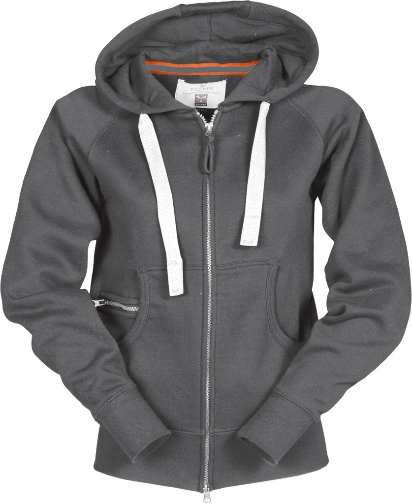 Zip po celé délce, kovový dvojcestný jezdec, kapuce s dvojitým prošitím švů, bílá stahovací šňůrka, kovová očka na kapuci, raglánové rukávy, klokaní kapsa, malá kapsa na zip, elastické manžety a spodní lem, vyztužené švy, vypasovaný střih