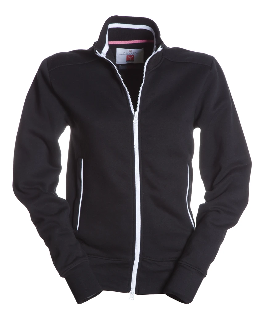 Plastový zip po celé délce, dvojcestný kovový jezdec, žebrovaný límec s kontrastním pruhem, 2 boční kapsy s kontrastním pruhem, vypasovaný střih, elastické manžety a spodní lem, vyztužené švy