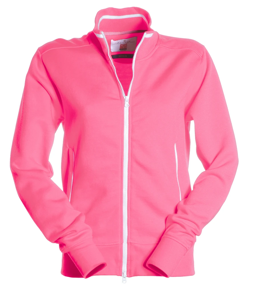 Plastový zip po celé délce, dvojcestný kovový jezdec, žebrovaný límec s kontrastním pruhem, 2 boční kapsy s kontrastním pruhem, vypasovaný střih, elastické manžety a spodní lem, vyztužené švy