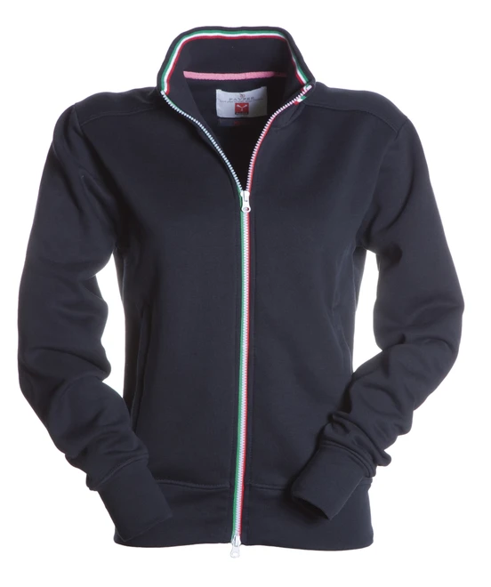 Vypasovaný střih, plastový zip po celé délce - v barvách italské vlajky, dvojitý jezdec, žebrovaný límec s kontrastním proužkem, vsazené rukávy, 2 kapsy, elastické manžety a spodní lem, vyztužené švy