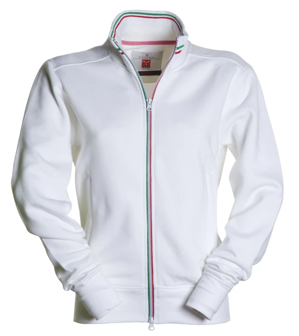Vypasovaný střih, plastový zip po celé délce - v barvách italské vlajky, dvojitý jezdec, žebrovaný límec s kontrastním proužkem, vsazené rukávy, 2 kapsy, elastické manžety a spodní lem, vyztužené švy