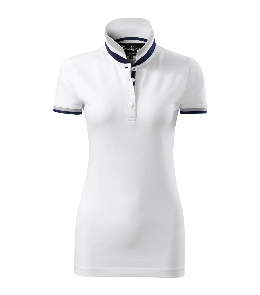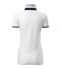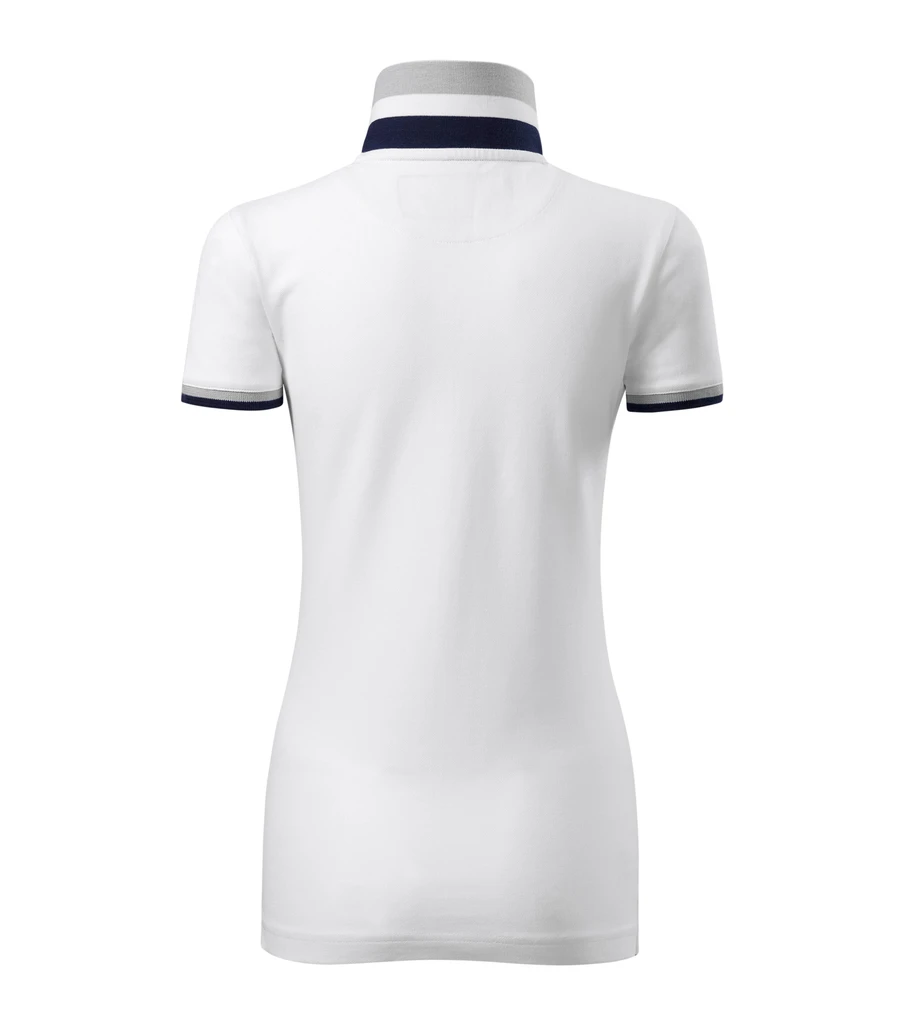 Krátký rukáv, kontrastní prvky, límeček a lemy rukávů z žebrového úpletu 1:1, začištění průkrčníku kontrastní páskou, léga s 4 knoflíčky, kontrastní tkaná páska na spodní léze, elegantní projmutý střih s rozparky v bočních švech zpevněné kontrastní páskou, lze prát na 40°C.
