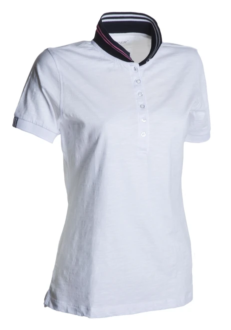 Krátký rukáv, zapínání na 6 knoflíčků - ve stejné barvě jako polokošile, límeček s kontrastními pruhy, na límečku a manžetách žebrované lemy, výztužná páska za krkem, boční rozparky