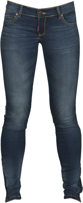 5 kapes, zapínání na kovový zip a knoflík, poutka na pásek v pase, nošený vybledlý vzhled, kontrastní švy, dvojité švy na vnitřní straně nohavic, obtažený střih, zip v dolní části nohavic