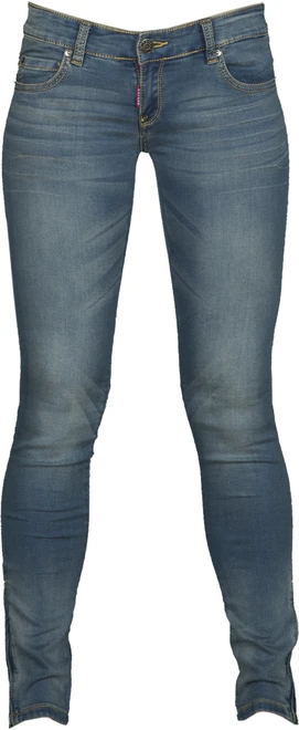 5 kapes, zapínání na kovový zip a knoflík, poutka na pásek v pase, nošený vybledlý vzhled, kontrastní švy, dvojité švy na vnitřní straně nohavic, obtažený střih, zip v dolní části nohavic