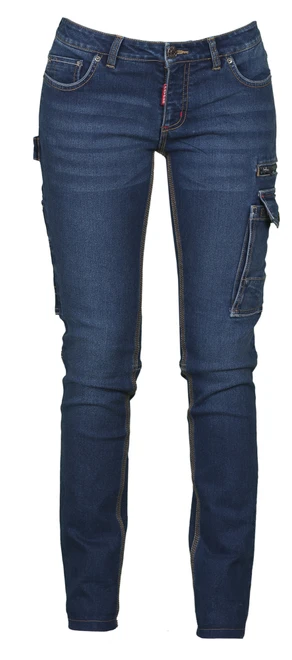 5 kapes, 2 velké vyztužené kapsy na bocích se zamykacím systémem, 1 boční kapsa na zip, 1 kapsa na mobilní telefon, držák na kladivo, držák na pero, zapínání na kovový zip a knoflík, poutka na pásek v pase, nošený vybledlý vzhled, kontrastní švy, trojité švy na vnitřní straně nohavic, rovný střih
