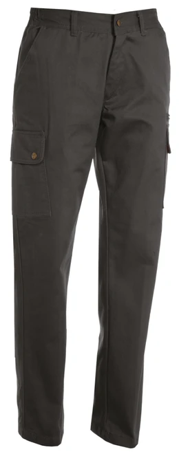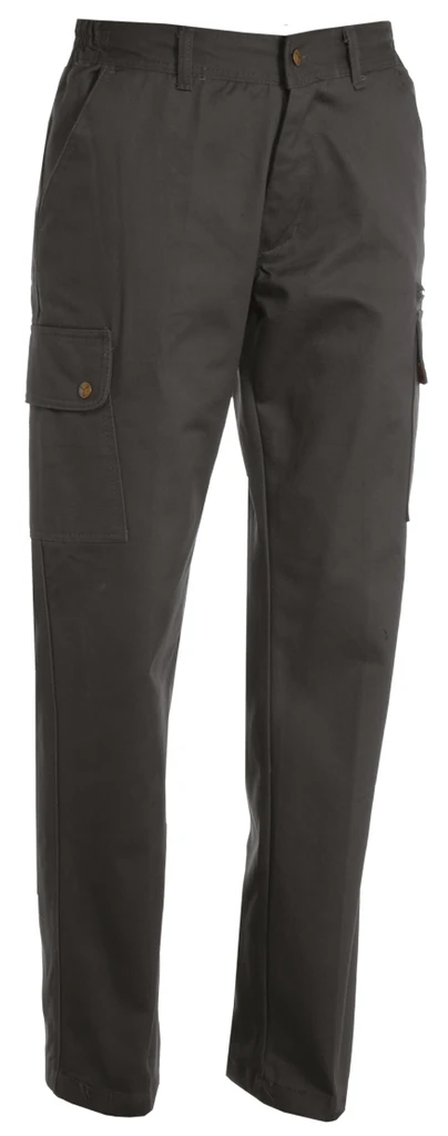 Vhodné na všechny roční období, elastické řasení na bocích, poutka na pásek, zapínání na zip a knoflík, 2 přední kapsy, 2 boční kapsy s klopou, na levé nohavici kapsa na zip, 2 zadní kapsy na knoflík