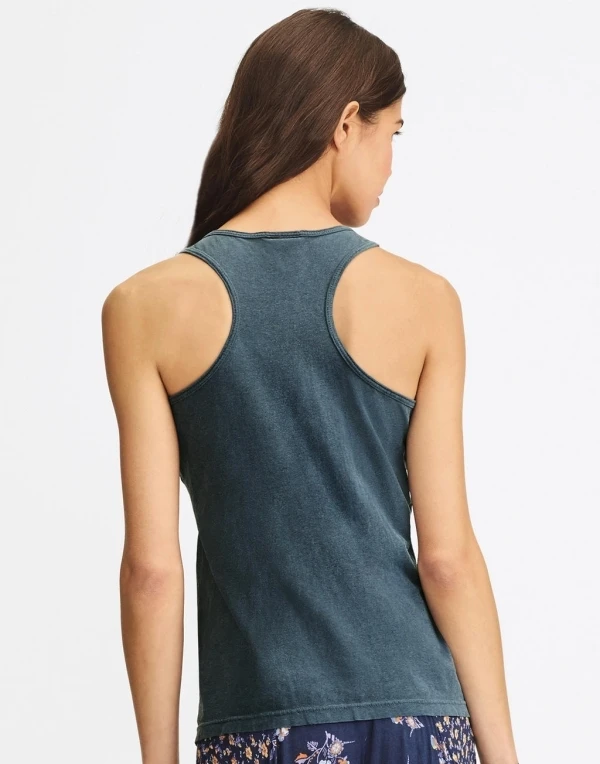 Předepraná, jednotlivě nabarvená tkanina (garment dye), kulatý výstřih, lem výstřihu a průramků ze stejné látky, dvojité prošití výstřihu, spodního lemu a průramků, postranní švy, lehce vypasovaný střih.