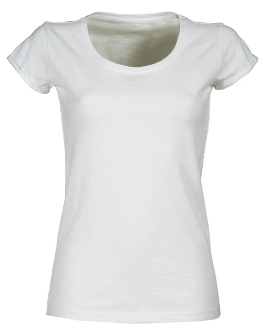 Krátký rukáv, mírně hlubší kulatý výstřih, vypasovaný střih, 10 mm široký lem okolo výstřihu s příměsí spandexu, dvojité švy na ramenou, rolované rukávy, boční švy, bez cedulky
