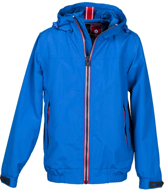 Po celé délce 8 mm široký plastový kontrastní zip, kapuce se stahovací šňůrkou a dvojitými švy, elastické manžety a spodní lem, 2 vnější kapsy na skrytý zip, bez vycpávky, síťovaná podšívka, vnitřní kapsa na mobilní telefon s vývodem na sluchátka