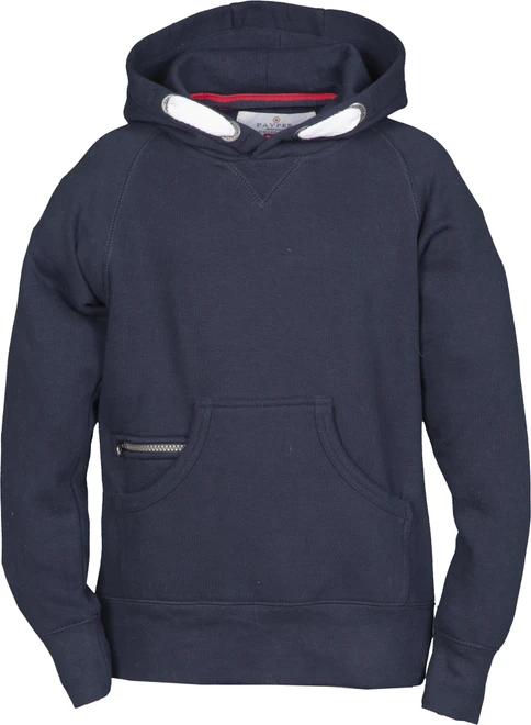 Dvojité švy, kapuce, dvojitá kovová očka na kapuci, bílá stahovací šňůrka, raglánové rukávy, dekorativní prošití do "V" pod výstřihem, klokaní kapsa, malá kapsa na zip, elastické manžety a spodní lem, vyztužené švy