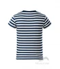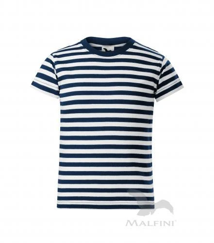 Pruhy v kombinaci navy a white, střih s bočními švy, úzký lem průkrčníku z žebrového úpletu 1:1 s 5 % elastanu, vnitřní část průkrčníku začištěna páskou z vrchového materiálu, zpevnění ramenních švů páskou, lze prát na 40°C.