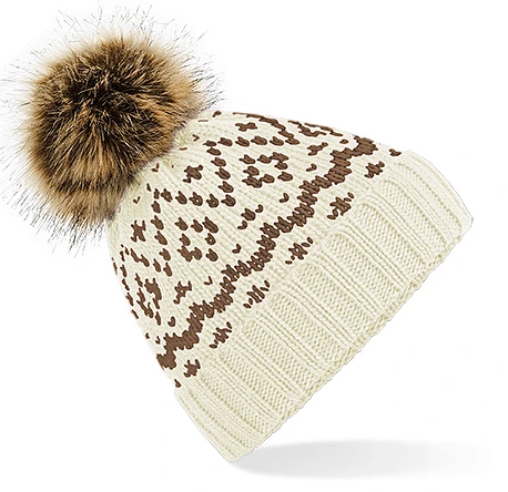 Štítek TearAway pro snadnou změnu značky, nadčasový norský vzor Fair Isle, odnímatelná bambule z umělé kožešiny, kompatibilní s ostatními produkty s bambulí, manžetový design pro optimální dekoraci