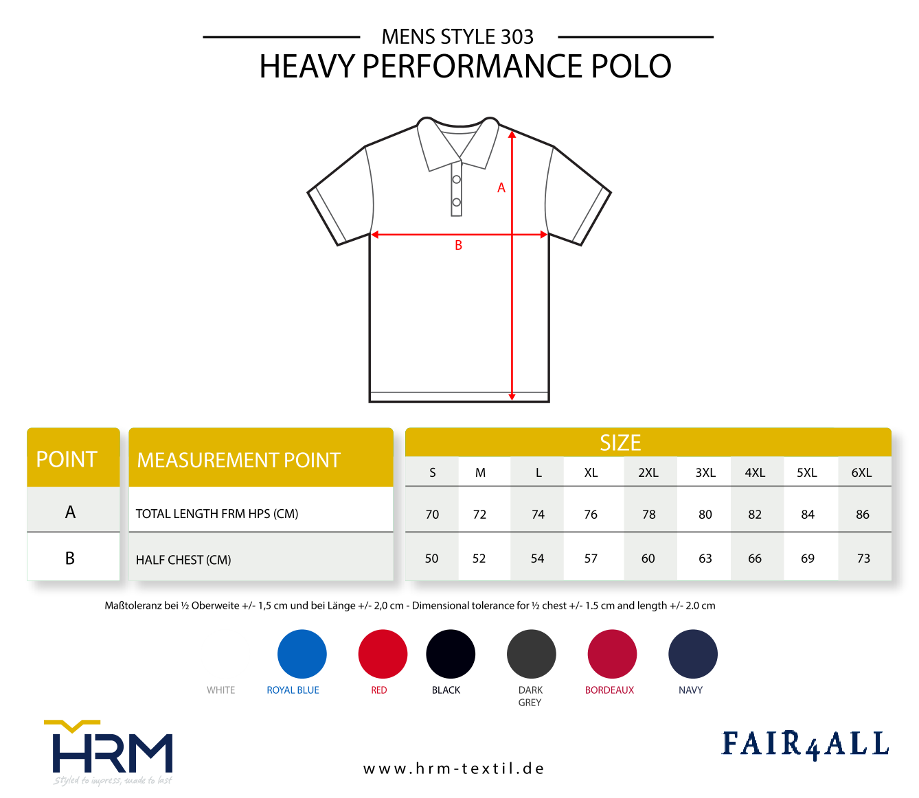 Naše pánské polokošile HRM Heavy Performance jsou vyrobeny z obzvláště robustního, prstencového piké s jemnou síťovinou vyrobeného z 65 % bavlny a 35 % polyesteru. Mají přiléhavý módní střih a zesílený límec a konce rukávů z žebrového úpletu 1x1. Tón v tónu 3-tlačítková léga s detaily HRM dodává polokošilím Heavy Performance jemný vzhled v každém detailu. Vyztužené boční rozparky a nákrčník od ramene k rameni zajišťují skvělé pohodlí při nošení a dlouhou životnost. Výkonnostní polokošile jsou, kromě tkaného štítku Fair4All v levém bočním švu, bez štítku. Lze je prát až na 60°C díky předúpravě proti srážení a žmolkování a obzvláště snadno se čistí i při vysokých a pravidelných pracích cyklech. Podíl polyesteru v materiálu zvyšuje komfort nošení a zajišťuje dokonalé padnutí. Jsou zvláště vhodné pro širokou škálu aplikací pracovních oděvů.