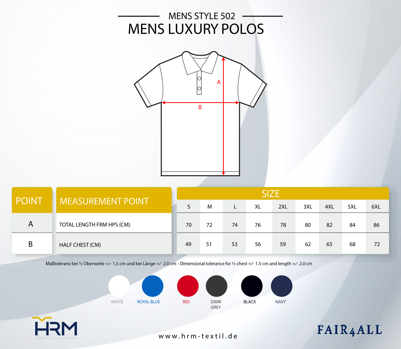 Naše luxusní pánské strečové polokošile HRM s inovativním zpracováním límečku jsou vyrobeny z 95 % bavlny a 5 % elastanu prstencového piké a mají módní, postavě padnoucí střih s légou na tři knoflíky tón v tónu s detaily HRM. Postranní rozparky vyztužené keprovým páskem a keprový nákrčník zajišťují skvělé pohodlí při nošení a dlouhou životnost. Vyznačují se obzvláště snadnou údržbou díky úpravě proti smršťování a žmolkování. Polokošile Luxury Stretch, kromě tkaného štítku Fair4All v levém bočním švu, jsou bez štítků. Díky obsahu elastanu se velmi pohodlně nosí, zejména v pracovní době a/nebo ve volném čase.