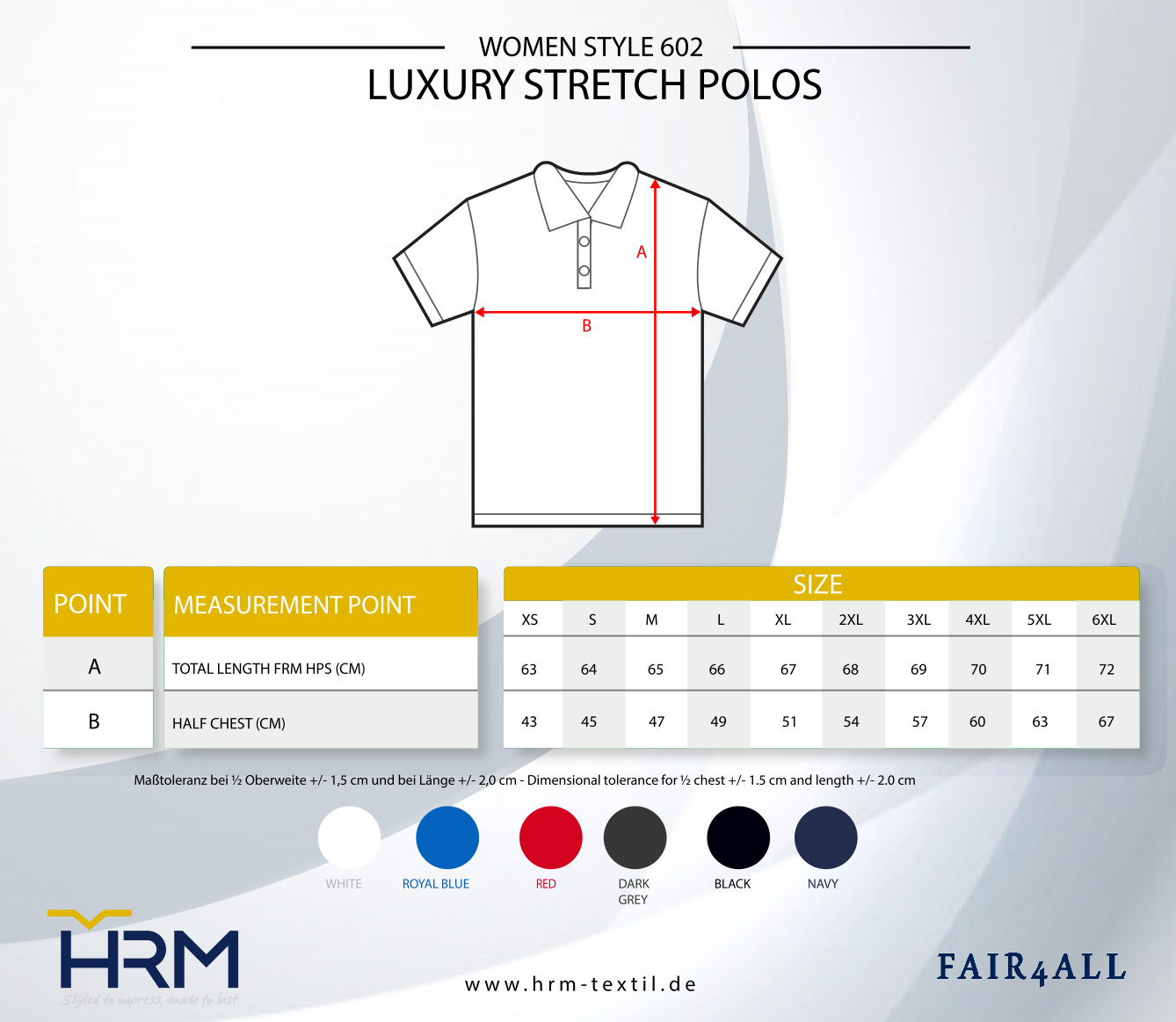 Naše dámské luxusní strečové polokošile HRM s inovativním zpracováním límečku jsou vyrobeny z 95 % bavlny a 5 % elastanu kroužkovaného piké a mají módní, postavě padnoucí střih s légou tón v tónu na 3 knoflíky s HRM. podrobnosti. Postranní rozparky zesílené keprovým páskem a keprový nákrčník zajišťují skvělý komfort nošení a dlouhou životnost. Vyznačují se obzvláště snadnou údržbou díky úpravě proti smršťování a žmolkování. Luxusní Stretch polokošile, s výjimkou tkaného vlajkového štítku Fair4All v levém bočním švu, jsou bez štítků. Díky obsahu elastanu se velmi pohodlně nosí, zejména v pracovní době a/nebo ve volném čase.