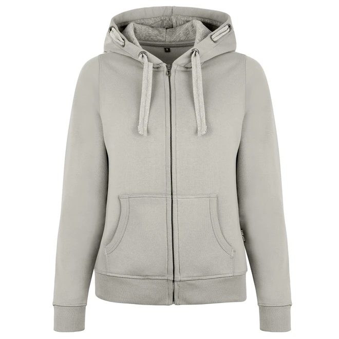 Dámské bundy s kapucí HRM jsou vyrobeny z nápadně měkké směsi 80 % bavlny a 20 % polyesteru. Speciálně navržené detaily, jako je kapuce s kontrastní podšívkou, 3 kovová očka HRM na každé straně, uprostřed vyšívaná plochá kontrastní šňůra a zip v tónu tónu s kovovým tahákem HRM jsou skutečným poutačem. Kapsy i pas mají zakončení žebrovým úpletem 2x2. Vyztužený barevně ladící nákrčník zvyšuje komfort nošení. Velmi hladká povrchová struktura zaručuje dobrou dokončovací schopnost. Bundy s kapucí jsou, kromě tkaného vlajkového štítku Fair4All v levém bočním švu, bez štítků. Jsou velmi univerzálně použitelné v chladném a větrném počasí.