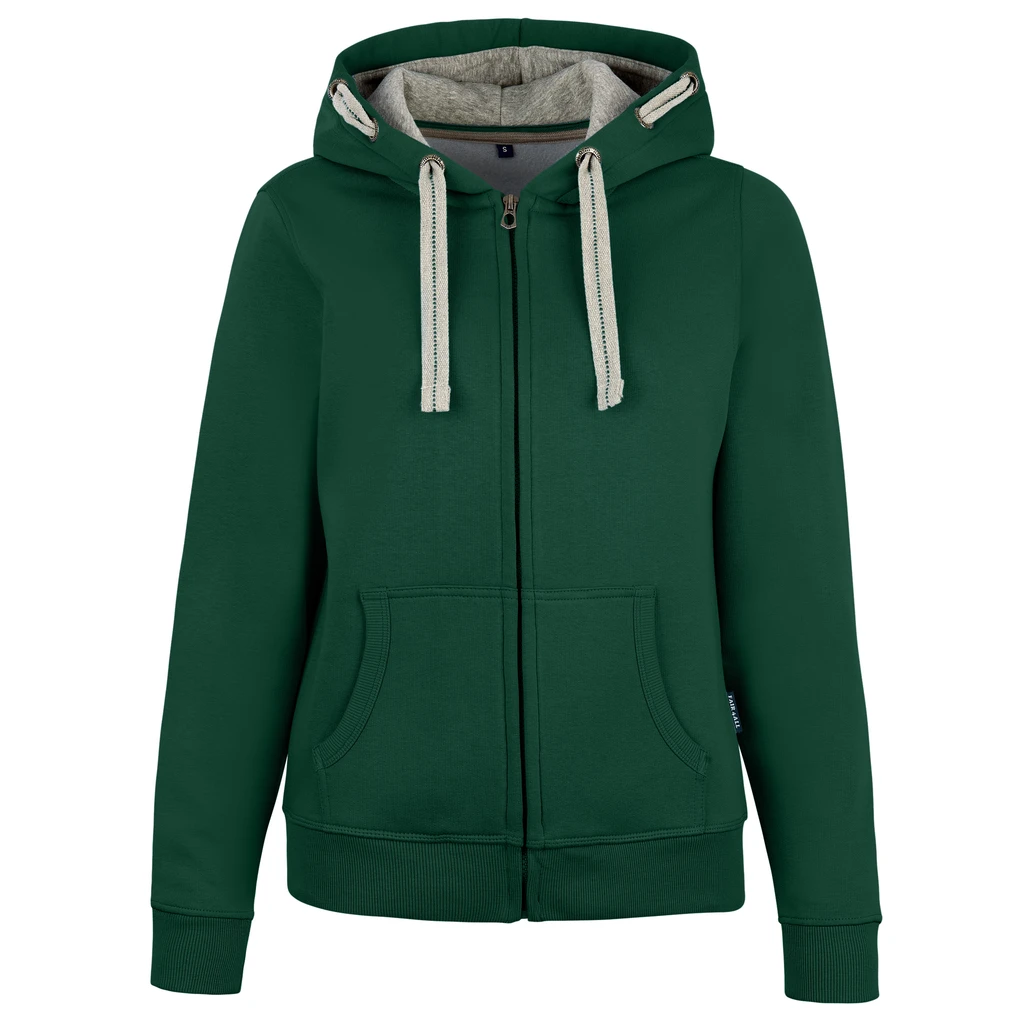 Dámské bundy s kapucí HRM jsou vyrobeny z nápadně měkké směsi 80 % bavlny a 20 % polyesteru. Speciálně navržené detaily, jako je kapuce s kontrastní podšívkou, 3 kovová očka HRM na každé straně, uprostřed vyšívaná plochá kontrastní šňůra a zip v tónu tónu s kovovým tahákem HRM jsou skutečným poutačem. Kapsy i pas mají zakončení žebrovým úpletem 2x2. Vyztužený barevně ladící nákrčník zvyšuje komfort nošení. Velmi hladká povrchová struktura zaručuje dobrou dokončovací schopnost. Bundy s kapucí jsou, kromě tkaného vlajkového štítku Fair4All v levém bočním švu, bez štítků. Jsou velmi univerzálně použitelné v chladném a větrném počasí.