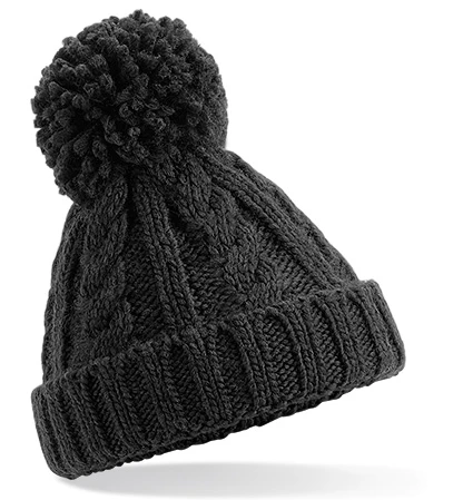 Štítek TearAway pro snadnou změnu značky, design s manžetou pro optimální dekoraci, těžký melanžový kabelový úplet, pocit ručního úpletu, bavlněná podšívka Jersey pro pohodlí a prodyšnost, nevyjímatelná bambulka pro větší bezpečnost, jednobarevná bambule