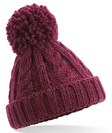 Štítek TearAway pro snadnou změnu značky, design s manžetou pro optimální dekoraci, těžký melanžový kabelový úplet, pocit ručního úpletu, bavlněná podšívka Jersey pro pohodlí a prodyšnost, nevyjímatelná bambulka pro větší bezpečnost, jednobarevná bambule