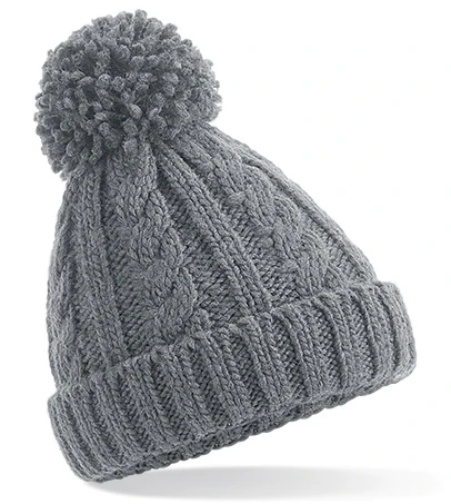 Štítek TearAway pro snadnou změnu značky, design s manžetou pro optimální dekoraci, těžký melanžový kabelový úplet, pocit ručního úpletu, bavlněná podšívka Jersey pro pohodlí a prodyšnost, nevyjímatelná bambulka pro větší bezpečnost, jednobarevná bambule