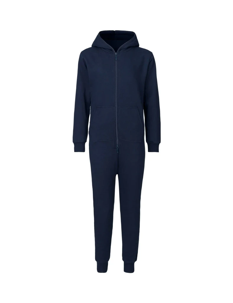 O73334-04-NavyOveral s kapucí, klokaní kapsou a dvojitým posuvným YKK zipem vpředu. S dvojitou podšívkou kapuce, boční kapsou na zip YKK a dvouvrstvými žebrovanými manžetami z elastanu na rukávech a nohavicích. Pohodlná vysoká hmotnost s měkkým kartáčovaným vnitřkem. Vyrobeno z prstencové česané bavlny o gramáži 300 g/m2.
