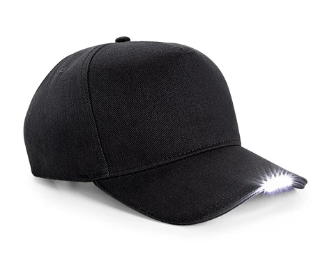 5 panelový design, předem zakřivený kšilt, prošitá ventilační očka, nepřetržitý nebo blikající LED osvětlovací systém, vyměnitelné lithiové články, ideální pro tisk a vyšívání, nastavení velikosti systémem Rip-Strip ™