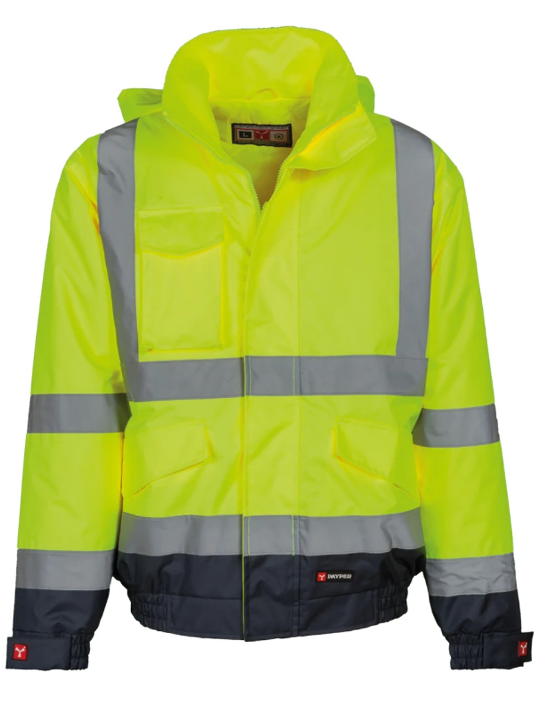 Reflexní pásky, vysoká viditelnost, zip po celé délce, přes zip klopa, kapuci lze schovat do límce, elastický pas a manžety, 2 velké přední kapsy s klopou na suchý zip, kapsa na mobilní telefon, držák na jmenovku, vatová vycpávka, vnitřní kapsa na suchý zip, tepelně lepené švy