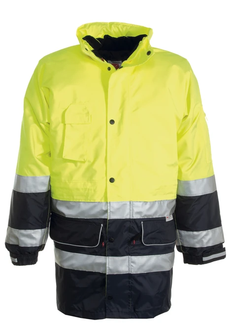Vysoká viditelnost, 3M reflexní pruhy, vnější bunda bez vycpávky, plastový zip po celé délce, kovový jezdec, přes zip klopa s cvočky, vypasovaný střih, kapuce se stahovacími šňůrkami, elastické nastavitelné manžety, 2 přední prostorné kapsy s klopou a zipem, kapsa na mobilní telefon, tepelně lepené švy. Vnitřní bunda s odnímatelnými rukávy, vatová vycpávka, elastické manžety, držák na jmenovku, na vnitřním límci mikrofleece