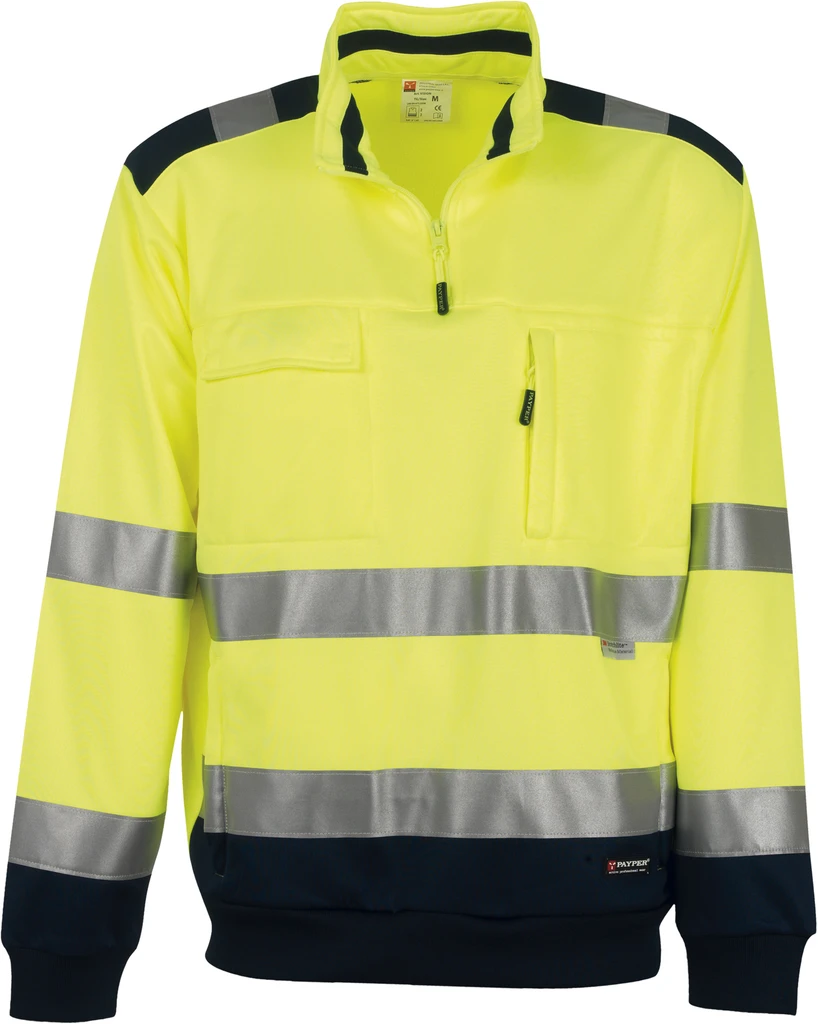 Vysoká viditelnost, 3M reflexní pruhy, nylonový zip do půlky délky, kovový jezdec, elastické žebrované manžety a spodní lem, 2 přední kapsy se skrytým zipem, náprsní kapsa se speciálním zavíracím systémem, odnímatelná jmenovka, kapsa na zip, vyztužené švy