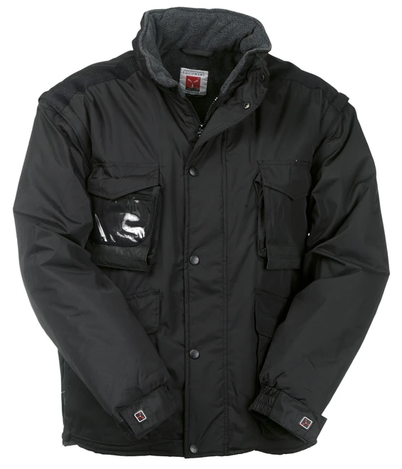 8 mm široký plastový zip po celé délce, kovový jezdec, klopa po celé délce s plastovými knoflíky, odnímatelné rukávy, nastavitelné manžety, kapuce schovaná v límci, vpředu i vzadu reflexní pruhy, boční ventilační otvor na zip, 5 vnějších kapes, vatová vycpávka, podšívka z microfleecu