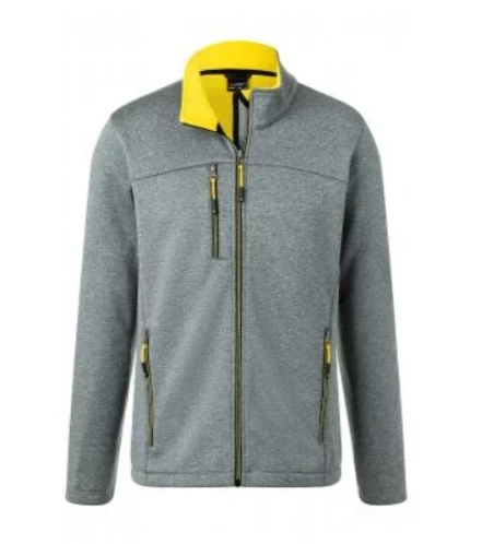 Příjemně měkký dvouvrstvý softshell, kontrastní podšívka z fleecu, zip po celé délce s ochranou brady, stojací límec, 2 boční kapsy na zip, náprsní kapsa na zip.
