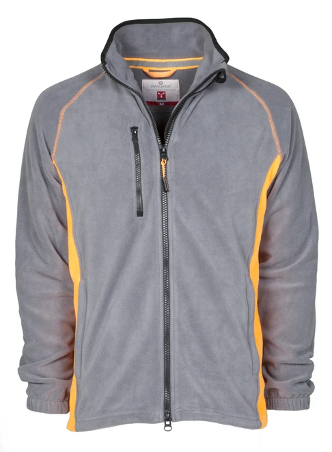 Černý plastový zip 8 mm široký, raglánové rukávy, stahovací šňůrka v pase, elastické manžety, 2 kapsy se skrytým zipem, 1 přední kapsa na hrudi, za krkem výztužná páska v kontrastní barvě, vyztužené švy