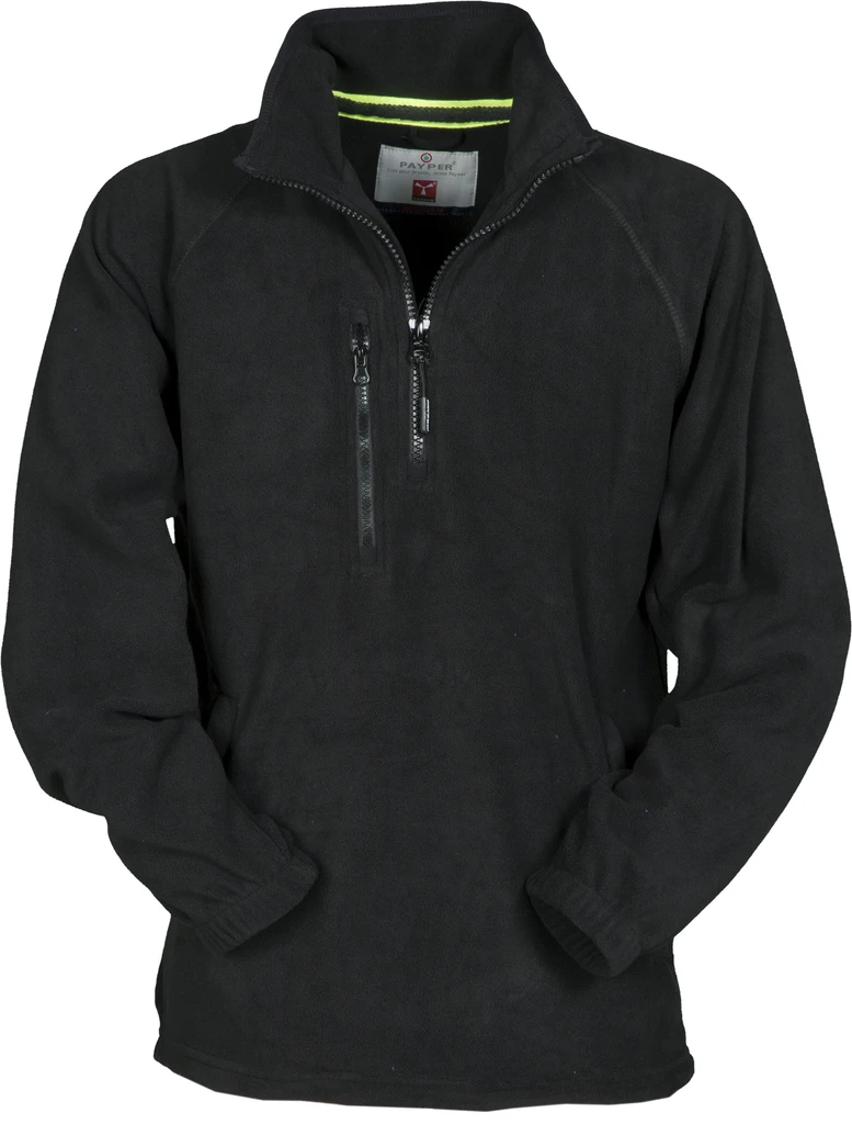 Do 1/2 délky černý plastový zip 8 mm široký, raglánové rukávy, stahovací šňůrka v pase, elastické manžety, 2 kapsy se skrytým zipem, 1 přední kapsa na hrudi, za krkem výztužná páska v kontrastní barvě, vyztužené švy