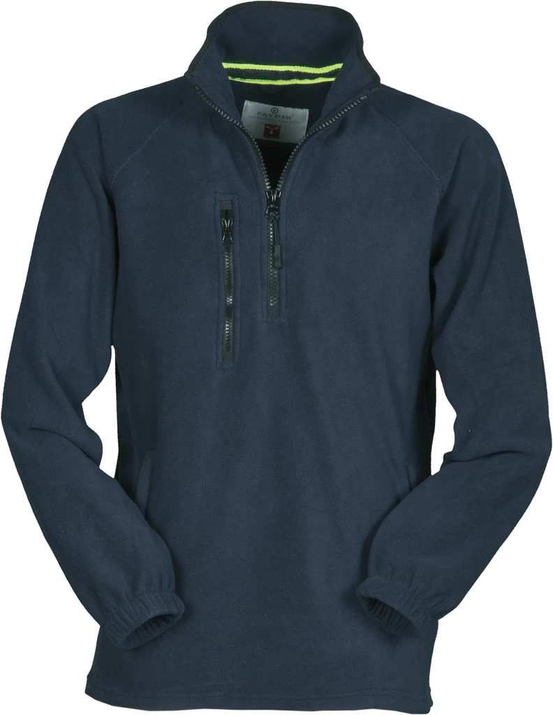 Do 1/2 délky černý plastový zip 8 mm široký, raglánové rukávy, stahovací šňůrka v pase, elastické manžety, 2 kapsy se skrytým zipem, 1 přední kapsa na hrudi, za krkem výztužná páska v kontrastní barvě, vyztužené švy