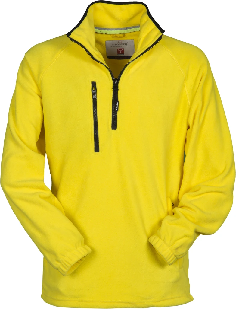 Do 1/2 délky černý plastový zip 8 mm široký, raglánové rukávy, stahovací šňůrka v pase, elastické manžety, 2 kapsy se skrytým zipem, 1 přední kapsa na hrudi, za krkem výztužná páska v kontrastní barvě, vyztužené švy