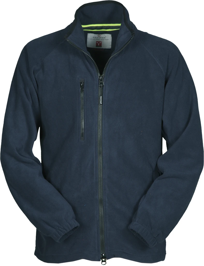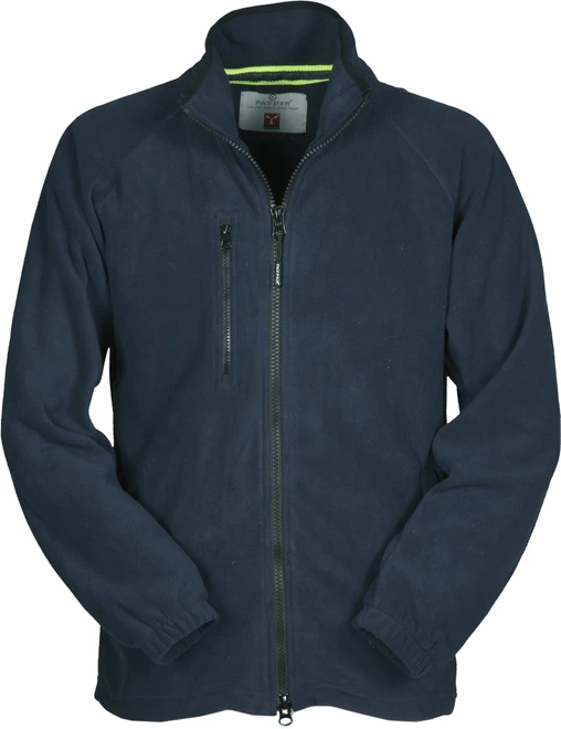 Černý plastový zip 8 mm široký, raglánové rukávy, stahovací šňůrka v pase, elastické manžety, 2 kapsy se skrytým zipem, 1 přední kapsa na hrudi, za krkem výztužná páska v kontrastní barvě, vyztužené švy