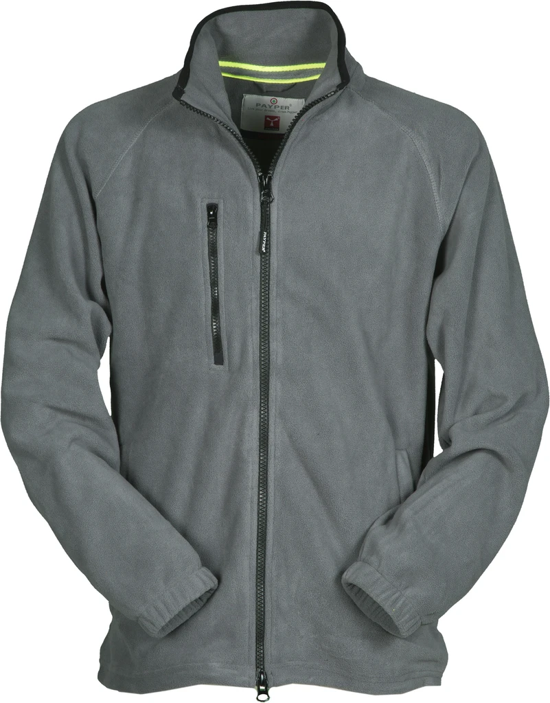 Černý plastový zip 8 mm široký, raglánové rukávy, stahovací šňůrka v pase, elastické manžety, 2 kapsy se skrytým zipem, 1 přední kapsa na hrudi, za krkem výztužná páska v kontrastní barvě, vyztužené švy