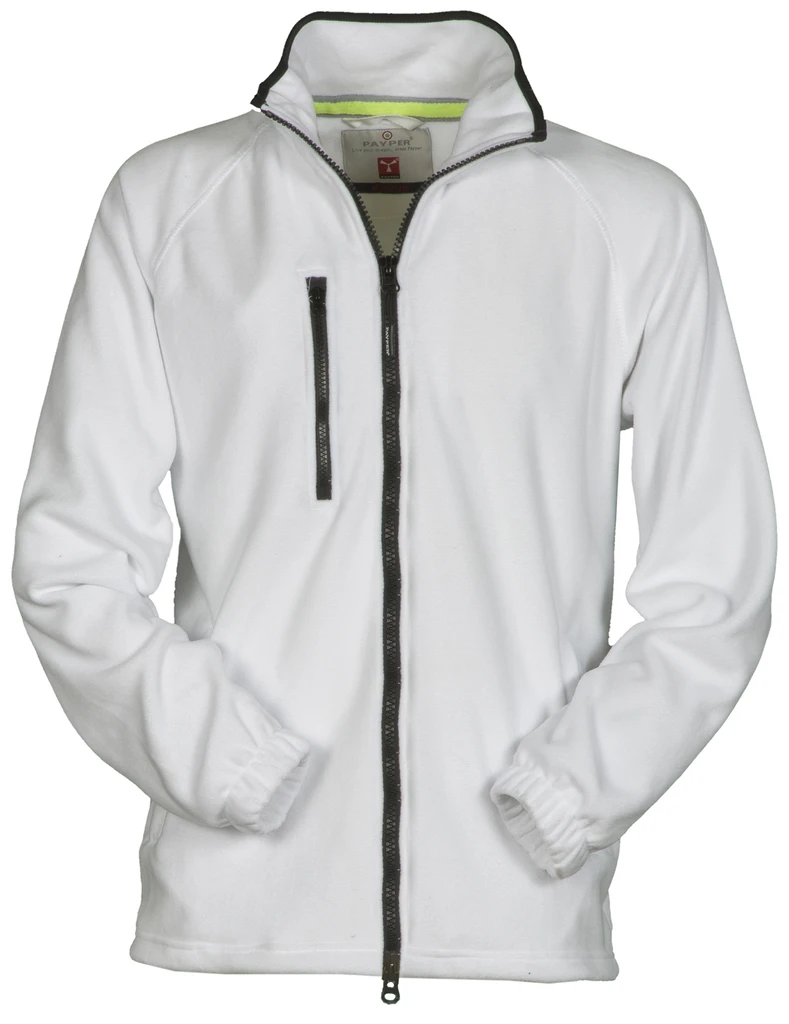 Černý plastový zip 8 mm široký, raglánové rukávy, stahovací šňůrka v pase, elastické manžety, 2 kapsy se skrytým zipem, 1 přední kapsa na hrudi, za krkem výztužná páska v kontrastní barvě, vyztužené švy